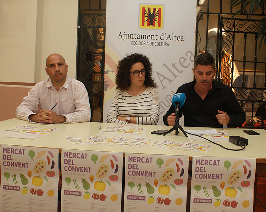 La segunda edición del Mercat del Convent, enfocando a los productos de otoño, se celebrará el próximo sábado 5 de noviembre, en horario de 9:30h a 19:30h. Esta iniciativa aglutina las concejalías de Medio Ambiente y Cultura con el fin de dar a conocer agricultores y promocionar sus productos de proximidad. Así lo han anunciado los ediles Jose Orozco y Aurora Serrat y el representante de la asociación alteana Agrollotja, Mariano Pérez, organizador del evento junto a Salmaia Art, y el Ayuntamiento de Altea. Cuenta también con la colaboración de la Concejalía de Comercio. La primera edición del Mercat tuvo un rotundo éxito en el pasado mes de junio.