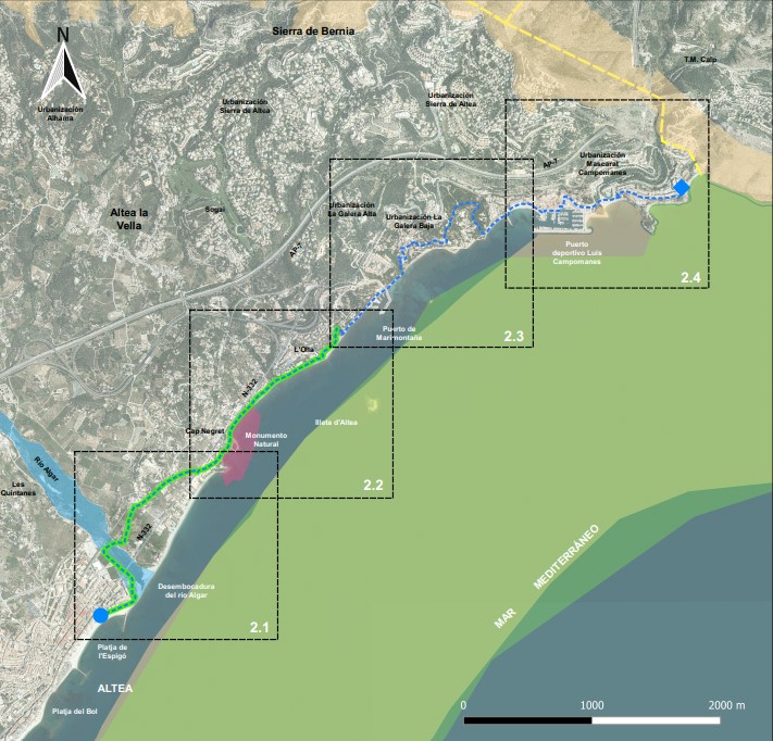 El sendero distinguido abarca la bahía de Altea, desde la plaza de Europa, situado en el núcleo urbano, hasta el mirador del Mascarat, mediante un itinerario costero y de elevado interés natural, cultural y paisajístico. Este sendero permite visitar diversos elementos de interés cultural y etnológico protegidos, además de discurrir por un humedal catalogado como la desembocadura del río Algar, el monumento natural del afloramiento volcánico de la playa fósil Cala del Soio y junto al entorno marino del Parque Natural de Serra Gelada.
