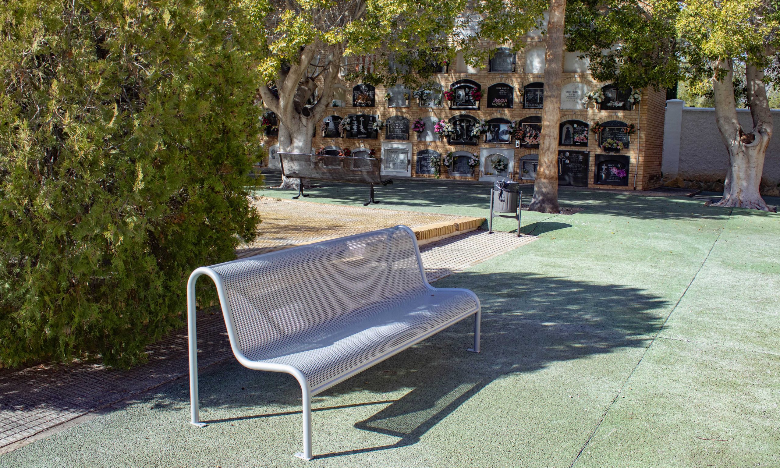 Los cementerios de Sant Jaume i Mare de Déu del Sofratge de Benidorm lucen 16 nuevos bancos de descanso de acero, que se han instalado dentro del plan de mejora de las instalaciones municipales que lleva a cabo la Concejalía de Cementerios que dirige Ángela Llorca.