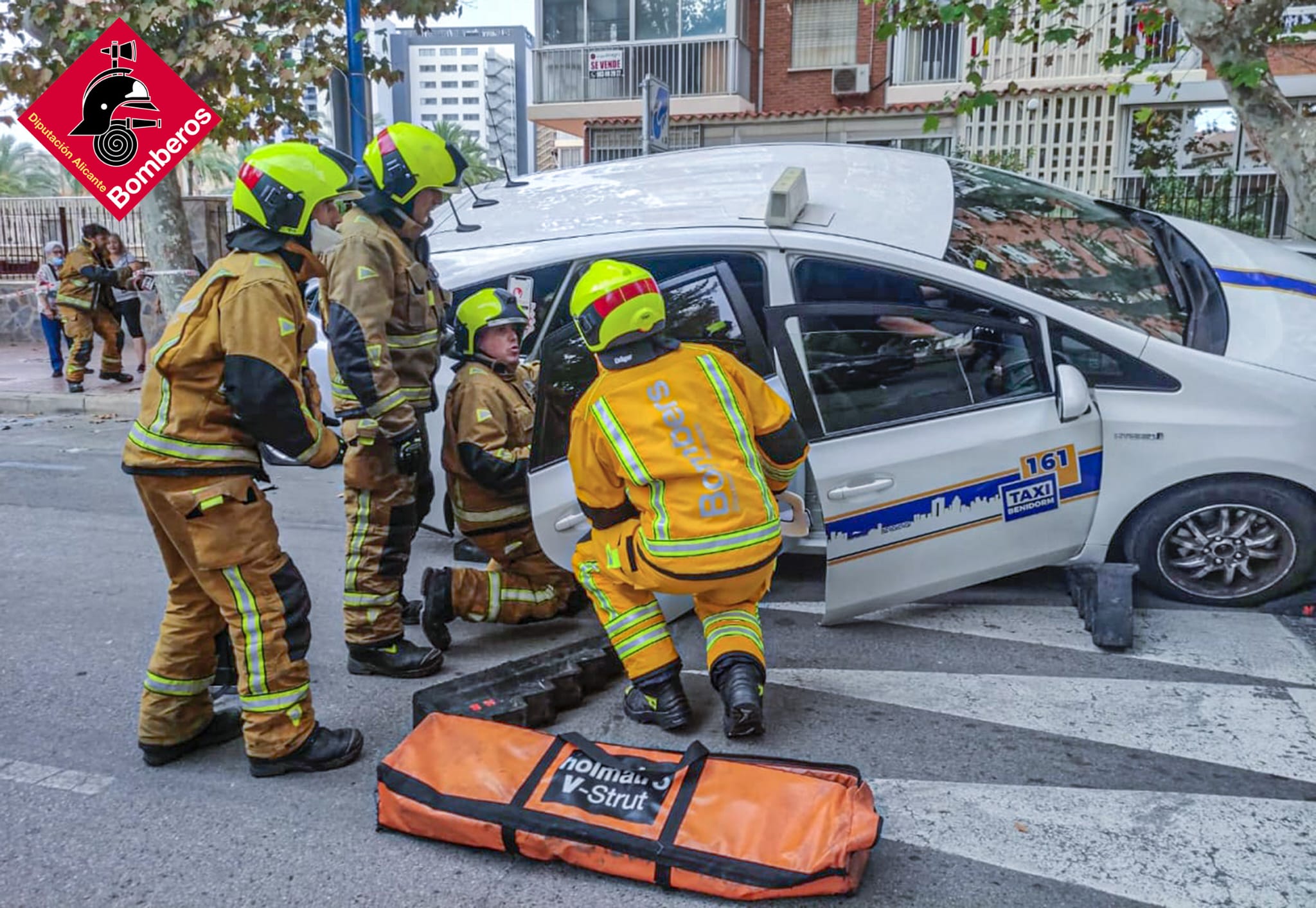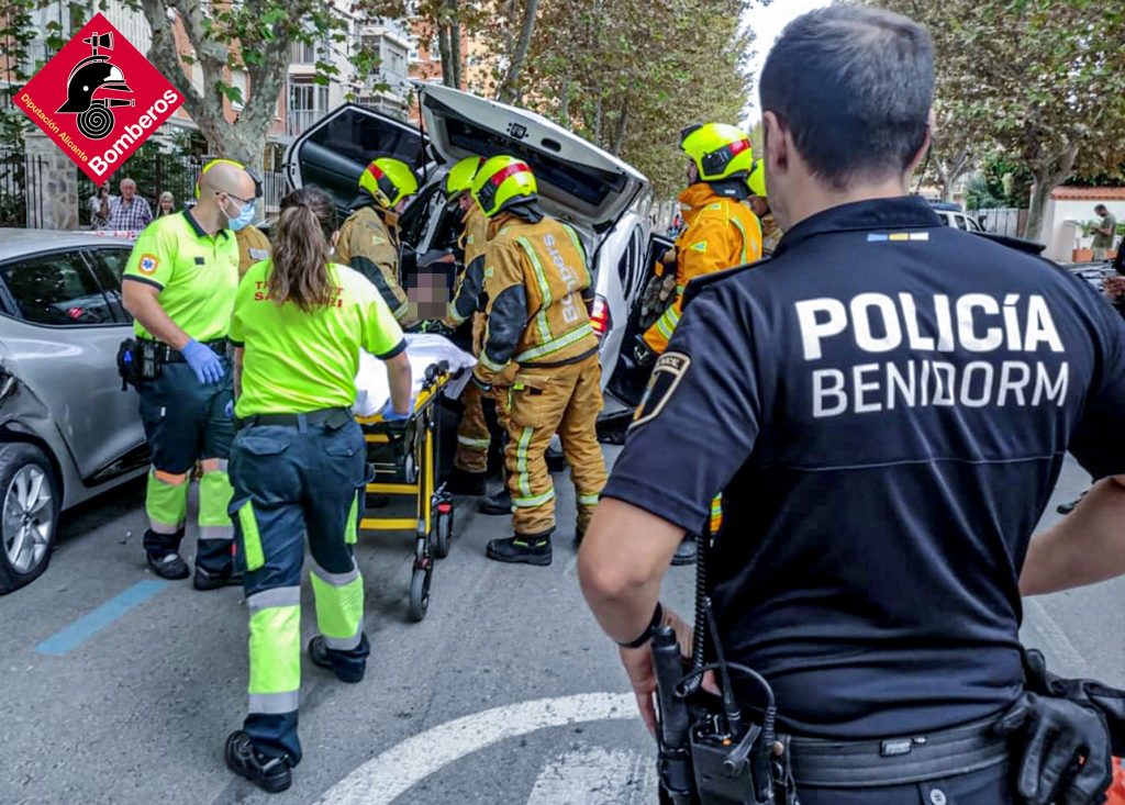 Un taxi, que, por causas desconocidas, perdía el control del vehículo y colisionaba sobre un turismo estacionado en la vía pública. De inmediato se activaban a los Servicios de Emergencia intervinientes, una dotación de la Policía Local de Benidorm, facilitaba el recorrido más idóneo a las dotaciones de los Bomberos Provinciales con base en el Parque en Benidorm.