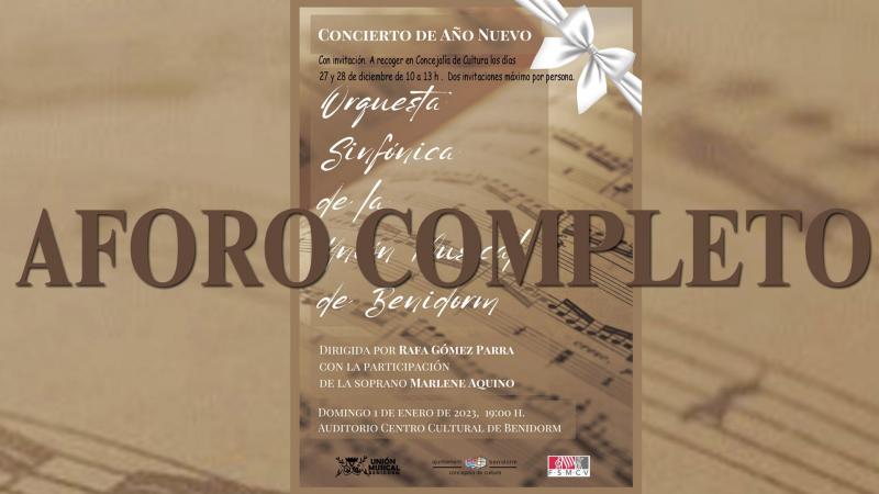 El Centro Cultural de Benidorm volverá a registrar un lleno absoluto el próximo 1 de enero con motivo del Concierto de Año Nuevo que ofrecerá la Orquesta Sinfónica de la Unión Musical de Benidorm. Las invitaciones para asistir a este evento ya se han agotado a lo largo de los dos días que estaban a disposición del público, los pasados 27 y 28 de diciembre, según ha informado la Concejalía de Cultura.