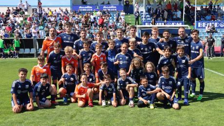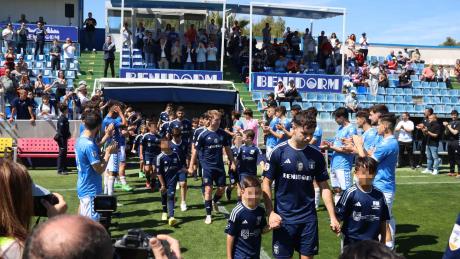 Varios centenares de aficionados se han dado cita este mediodía en el estadio Guillermo Amor para celebrar el reciente ascenso de categoría del CF Benidorm, que la jornada pasada lograba matemáticamente subir hasta Tercera RFEF del fútbol español.