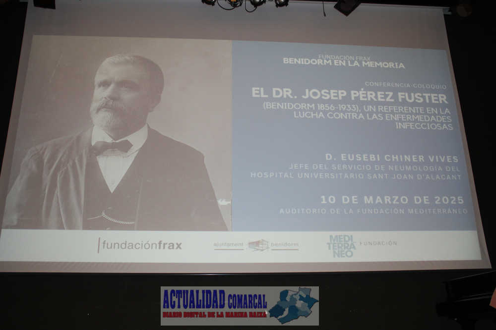 El homenaje finalizó en el Aula de Cultura de la Fundación Mediterráneo, en la calle Alameda del Alcalde Pedro Zaragoza, en donde se ofreció la conferencia titulada ‘El Doctor Josep Pérez Fuster, un referente en la lucha contra las enfermedades infecciosas’, a cargo del jefe del servicio de Neumología del Hospital Universitario de Sant Joan d’Alacant, Eusebi Chiner Vives. La conferencia fue organizada conjuntamente por el Ayuntamiento y la Fundación Frax y logró llenar el recinto en su totalidad.