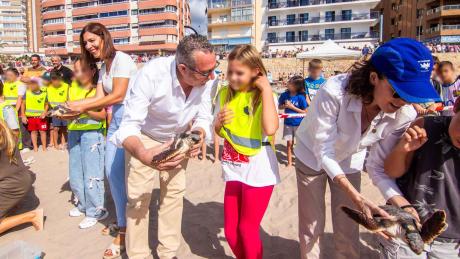 El alcalde de Benidorm, Toni Pérez, acompañado de la edil de Playas y Medio Ambiente, Mónica Gómez, y otros miembros de la Corporación municipal, ha participado en esta suelta de tortugas junto a escolares de los colegios La Cala, El Murtal y Bautista Lledó, nueve de los cuales han podido intervenir directamente en la devolución al mar de las pequeñas crías.