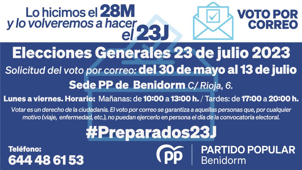 El Partido Popular de Benidorm anima a todos los ciudadanos que no puedan acudir personalmente a las urnas el 23 de julio a que aprovechen esta oportunidad y realicen la tramitación del voto por correo en nuestra sede.