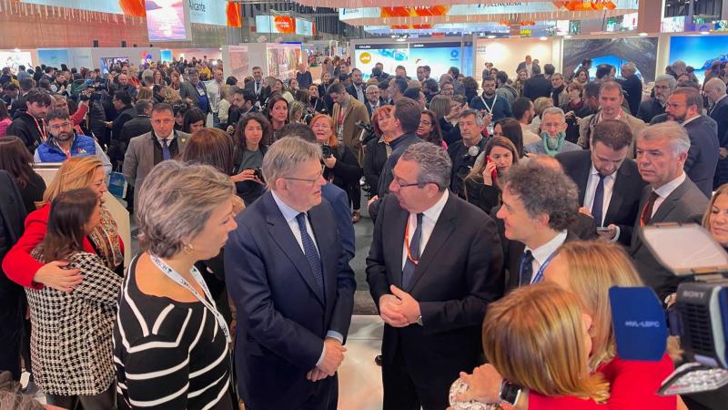 Benidorm ha sido la primera parada del presidente de la Generalitat, Ximo Puig, en su visita a la Feria Internacional de Turismo (Fitur) de Madrid, en la que hoy se celebra el Dia de la Comunitat Valenciana. El alcalde, Toni Pérez; el presidente de la patronal hotelera Hosbec, Fede Fuster; la secretaria general de la entidad, Nuria Montes; y miembros de la Corporación municipal han recibido al presidente en el stand de Benidorm, donde ha llegado acompañado por la ministra de Ciencia e Innovación, Diana Morant, y por el secretario autonómico de Turismo, Francesc Colomer, entre otros.