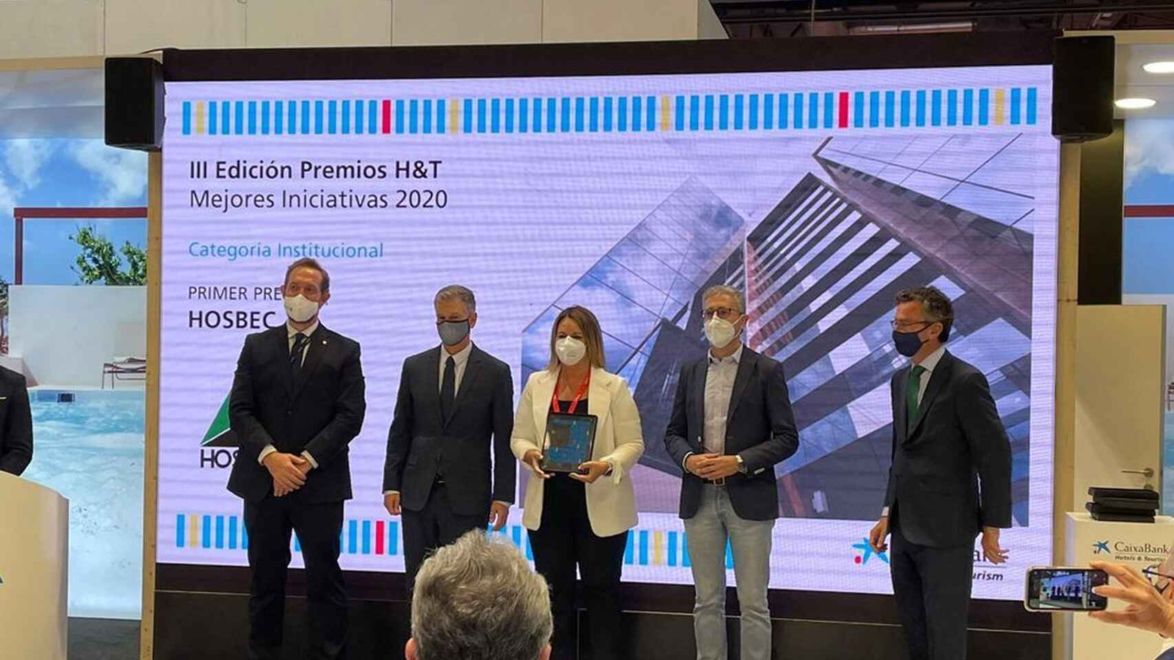 La patronal hotelera de Benidorm y de la Comunitat Valenciana, Hosbec, ha sido reconocida por Caixa Bank en la tercera edición de los Premios H&T a las mejores iniciativas de 2020 por su acción social durante la pandemia. La secretaria general de Hosbec, Nuria Montes, ha recogido este galardón durante un acto celebrado en el pabellón 8 de la Feria Internacional de Turismo de Madrid (FItur), en el que ha participado el secretario de Estado de Turismo, Fernando Valdés, y al que ha asistido la primera teniente de alcalde del Ayuntamiento de Benidorm, Ana Pellicer.