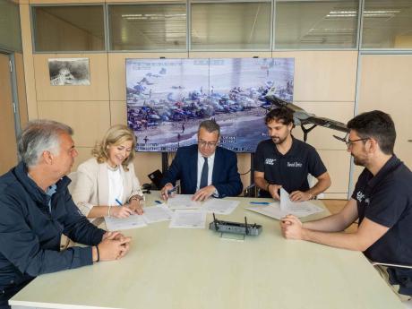 La Unidad Aérea de la Policía Local de Benidorm ha incorporado a su flota un nuevo dron de última generación, que va a incrementar su capacidad operativa en las actuaciones que se lleven a cabo en el mar, la montaña y grandes eventos, tanto en horario diurno como nocturno. El alcalde, Toni Pérez, y David Ortiz, administrador de la empresa valenciana UAV Works, que ha desarrollado la aeronave, han firmado hoy un convenio de colaboración para la cesión del dron durante un año.