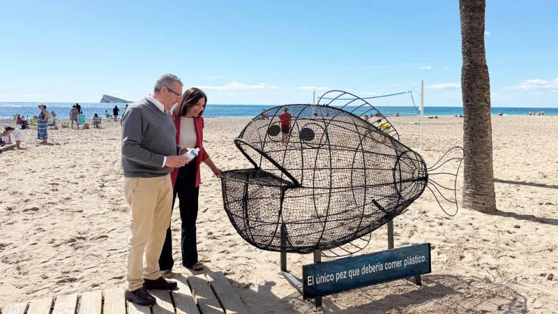 La Concejalía de Playas y Medio Ambiente del Ayuntamiento de Benidorm ha instalado en la playa de Poniente una escultura con forma de pez que tiene como objetivo fomentar el reciclaje de plástico en las playas y evitar que estos residuos acaben en el mar. La pieza forma parte del proyecto de concienciación sobre la importancia del reciclaje que desarrolla la concejalía que dirige la edil Mónica Gómez, que hoy ha visitado esta primera escultura junto al alcalde Toni Pérez, para comprobar la acogida de la misma entre los usuarios de las playas.