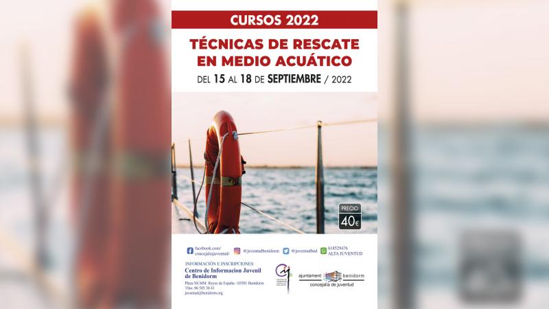 La Concejalía de Juventud del Ayuntamiento de Benidorm ha organizado un curso de técnicas de rescate en medio acuático, que se celebrará del 15 al 18 de septiembre. El objetivo del curso es dotar a los inscritos de los conocimientos necesarios acerca del entorno acuático y sus características, así como de las diferentes técnicas de rescate.