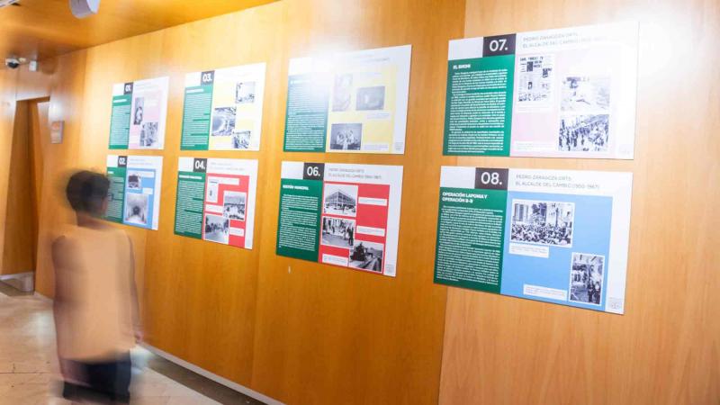 El primero de los apartados recoge apuntes biográficos del político benidormense, su trayectoria en el Ayuntamiento, la posterior como gobernador civil de Guadalajara o su vida tras su retirada de la política. Otro panel muestra imágenes y textos relativos al problema del agua en Benidorm, el momento en que se adquirió un pozo manantial en Polop para abastecer a la ciudad o el proyecto de canalización.