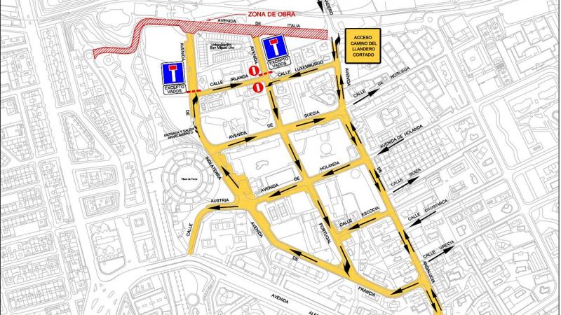 Mientras dure el corte, para alcanzar el parking del Recinto Ferial los vehículos deberán seguir el siguiente itinerario: circular por la avenida Andalucía y posteriormente tomar las avenidas Francia u Holanda hasta alcanzar la avenida Inglaterra. Asimismo, sólo se permitirá el acceso al tramo alto de las avenidas Inglaterra y Portugal a residentes con vado.