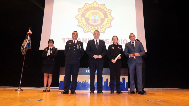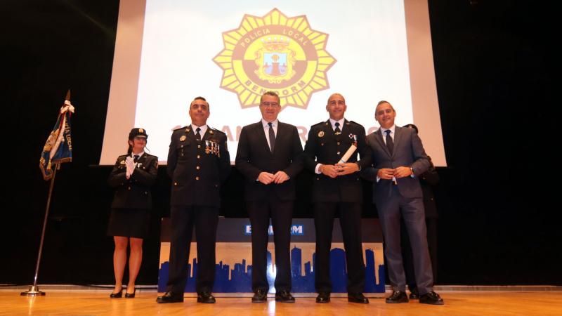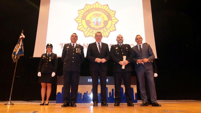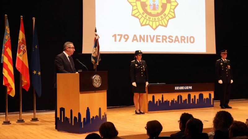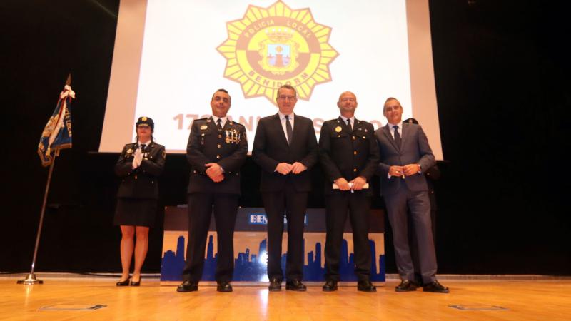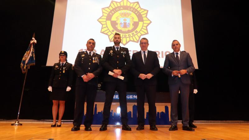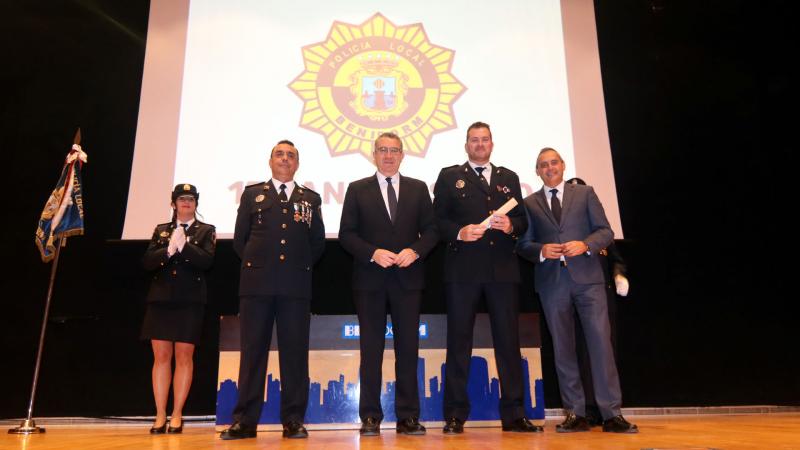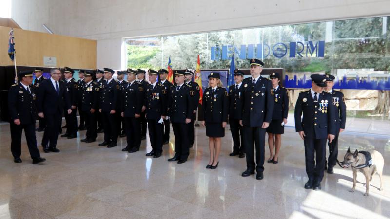 Unas felicitaciones y reconocimientos a los que se ha sumado el alcalde, que ha sido el encargado de cerrar el acto. Toni Pérez ha destacado “el respeto, la valentía y el rigor” con que los agentes “defendéis leyes y Constitución, al tiempo que ayudáis y protegéis personas y bienes, vigilantes siempre de conferir seguridad” a quienes “hacemos de Benidorm lugar de residencia, trabajo, ocio o descanso, velando por la tranquilidad y seguridad de todos, junto a las Fuerzas y Cuerpos de la Seguridad del Estado” con presencia en la ciudad.