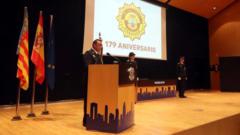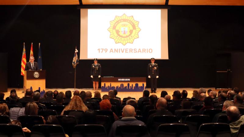La Policía Local de Benidorm ha conmemorado hoy el 179º aniversario de su fundación con un acto institucional que se ha celebrado en el salón de actos del Ayuntamiento. Un aniversario que oficialmente se cumplió el pasado día 1 de marzo y que desde la Asociación Sociocultural de la Policía Local han festejado con una serie de actos que empezaron el sábado 25 de febrero y que se prolongarán hasta el 1 de abril.