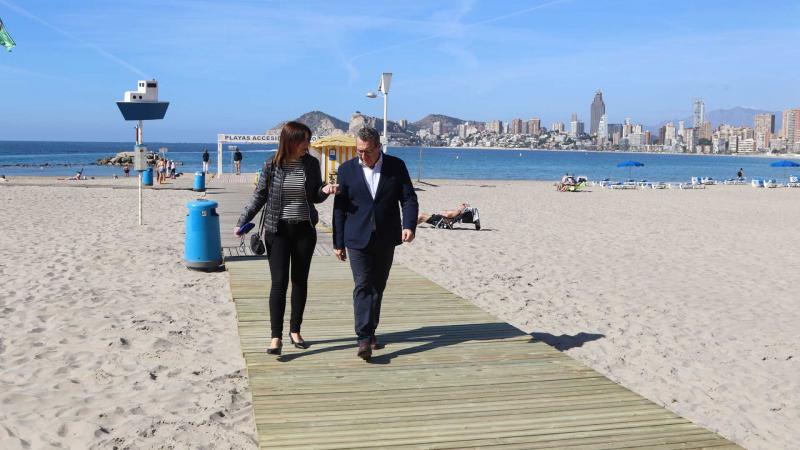 A 10 días del inicio de la Semana Santa en diversas comunidades autónomas, las playas de Benidorm se preparan ya para la primera gran cita turística del año. Así lo han comprobado el alcalde, Toni Pérez, y la concejal del área, Mónica Gómez, que han visitado los arenales de la ciudad para ver cómo avanzan las labores de instalación, montaje y renovación de elementos y mobiliario en las playas.