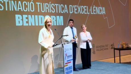 La ciudad de Benidorm ha logrado el ‘Premi Turisme Comunitat Valenciana’ en la categoría de Destino Turístico de Excelencia. La alcaldesa en funciones, Ana Pellicer, ha recogido hoy este galardón de manos del presidente de la Generalitat Valenciana, Carlos Mazón, y en presencia de la consellera de Innovación, Industria, Comercio y Turismo, Marian Cano, en un acto celebrado en el centro Bombas Gens d’Arts Digitals de València, al que también ha asistido el segundo teniente de alcalde y diputado autonómico, José Ramón González de Zárate.