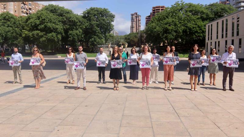El Ayuntamiento de Benidorm ha vuelto a condenar la violencia de género con un minuto de silencio en memoria de la última víctima, una mujer asesinada en Pamplona. La Plaza de Sus Majestades los Reyes de España ha acogido esta concentración silenciosa que ha estado encabezada por la primera teniente de alcalde, Ana Pellicer, la concejal de Igualdad, Ángela Zaragozí, y otros miembros de la Corporación.