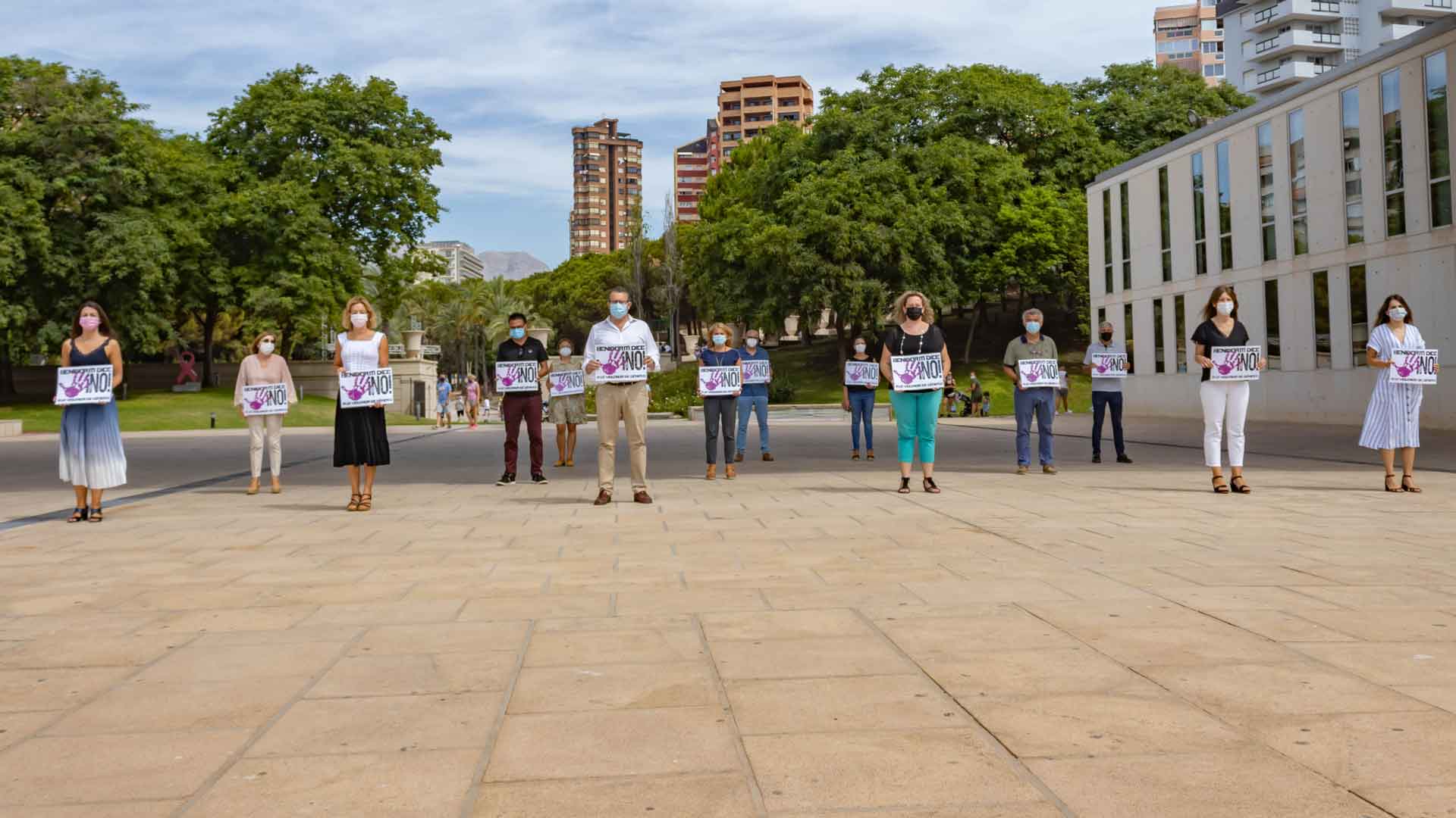 El Ayuntamiento de Benidorm, con su alcalde, Toni Pérez, y la concejal de Igualdad, Ángela Zaragozí, a la cabeza, ha guardado este mediodía un minuto de silencio en memoria de la mujer que fue asesinada por su pareja el pasado domingo.