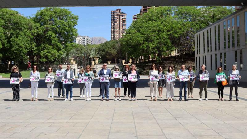 El Ayuntamiento de Benidorm ha mostrado hoy su repulsa y condena ante el último crimen confirmado por violencia de género cometido el pasado 6 de mayo en Tarrasa (Barcelona) con una concentración silenciosa en la Plaza de Sus Majestades Reyes de España, encabezada por el alcalde, Toni Pérez, y la concejal de Igualdad, Ángela Zaragozí, en la que también han estado miembros de la corporación municipal.
