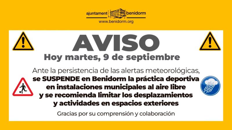 Ante la persistencia de las alertas meteorológicas por fuertes lluvias y posibilidad de inundaciones decretadas por el 112 Comunitat Valenciana y por la Agencia Estatal de Meteorología, el Ayuntamiento de Benidorm ha suspendido las actividades deportivas al aire libre en instalaciones municipales, como previamente había hecho con las clases en todos los centros escolares.