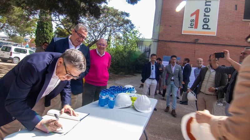El alcalde de Benidorm, Toni Pérez, y el conseller de Educación, Cultura, Universidades y Empleo de la Generalitat Valenciana, José Antonio Rovira, han asistido hoy a la firma del acta de inicio de las obras del Instituto de Educación Secundaria (IES) Pere Mª Orts i Bosch, adjudicadas por 12.888.556,50 euros y que convertirán al IES decano de la ciudad en una infraestructura educativa “moderna y adaptada al siglo XXI”. “Estamos en un día histórico para este instituto, para la comunidad educativa y para toda la ciudad”, ha afirmado el primer edil, que además ha indicado que “sólo va a haber un día más importante que éste, que será el día en el que alumnado y docentes tomen posesión de las nuevas instalaciones, recuperando así una normalidad que llevamos muchos años esperando”.