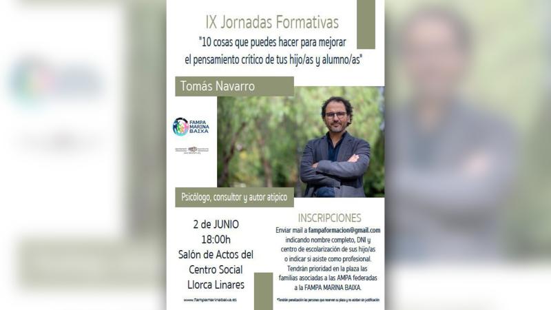 La concejal de Educación, Maite Moreno, ha explicado que “en esta ocasión, la conferencia correrá a cargo del psicólogo, escritor y consultor Tomás Navarro, y lleva por título ‘10 cosas que puedes hacer para mejorar el pensamiento crítico de tus hijos/as y alumno/a’, por lo que consideramos que puede ser de gran interés”.