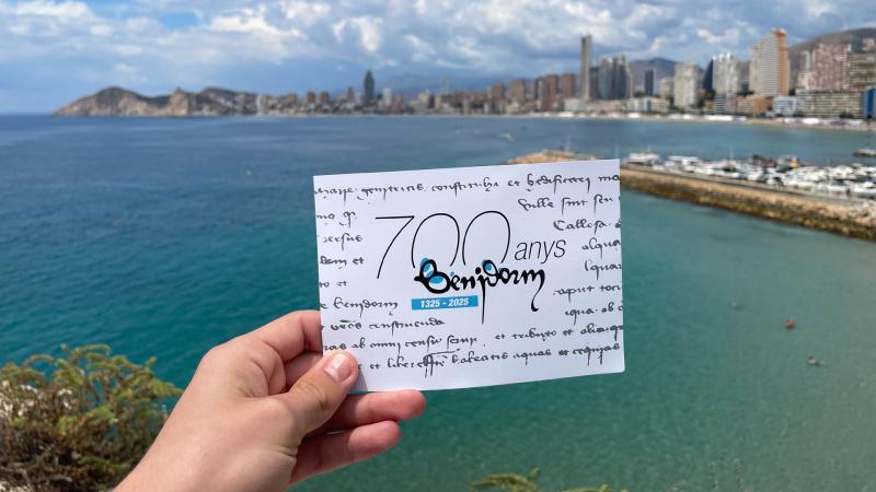 Las postales editadas por el Ayuntamiento reproducen el logotipo oficial del 700 aniversario de la fundación de Benidorm como municipio con entidad jurídica propia, con el otorgamiento de la Carta de Poblament por parte de Bernat de Sarrià el 8 de mayo de 1325.