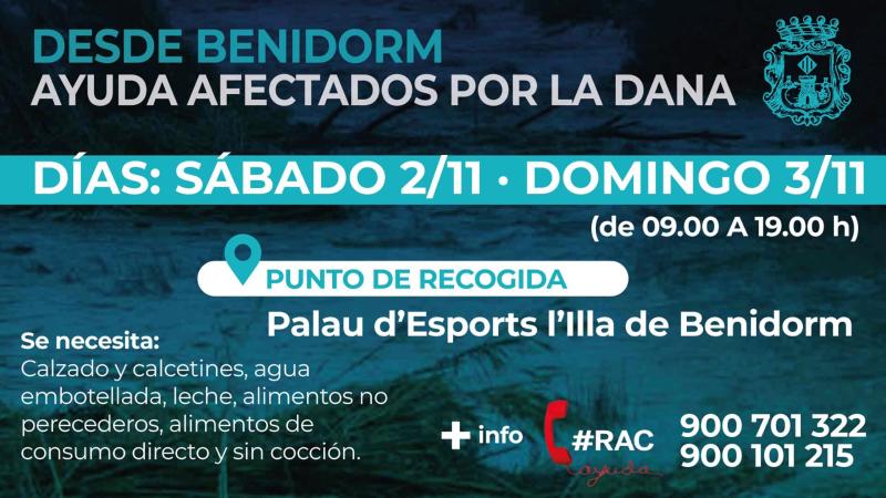 El Ayuntamiento de Benidorm ha habilitado un punto de recogida de ayuda para los afectados por la DANA que estará operativo este sábado y domingo, 2 y 3 de noviembre, en el Palau d’Esports l’Illa en horario de 09.00 a 19.00 horas. Según las necesidades trasladadas por la coordinación de Emergencias, se precisa calzado y calcetines, agua embotellada, leche, alimentos no perecederos y alimentos de consumo directo y sin cocción.