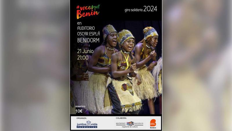 El coro africano ‘Voces por Benin’ actuará en Benidorm el próximo 21 de junio a las 21 horas en el auditorio Óscar Esplá del Parque de l’Aigüera. El concierto se enmarca en la gira que realiza este verano por diferentes ciudades españolas con su nuevo espectáculo de música y danza en defensa de los derechos de la infancia. Organizado por la Fundación Juntos por la Vida, cuenta con la colaboración del Ayuntamiento de Benidorm.