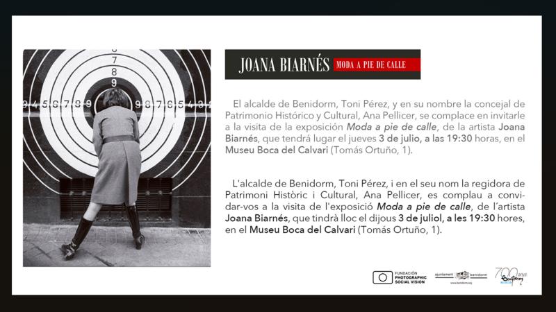 El Museu Boca del Calvari va a albergar durante los próximos meses la exposición ‘Moda a pie de calle’, de la reconocida fotógrafa Joana Biarnés (1935-2018), considerada la primera mujer fotoperiodista de España y cuya obra custodia y difunde la Fundación Photographic Social Vision. La exposición, promovida por la Concejalía de Patrimonio Histórico y Cultural del Ayuntamiento de Benidorm en colaboración con dicha fundación, será inaugurada este jueves, 3 de julio, a las 19.30 horas y podrá visitarse en este museo municipal hasta el 19 de octubre.