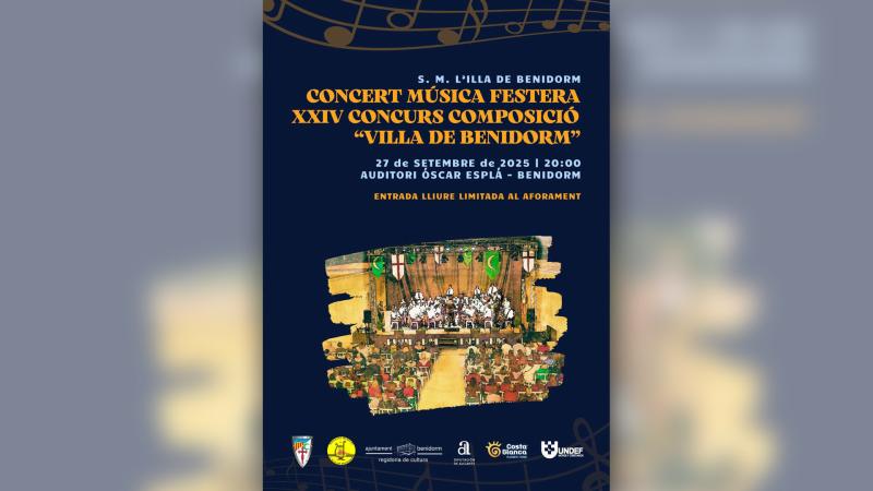 El concierto, organizado por las Concejalías de Cultura y Fiestas, correrá a cargo de la Societat Musical L’Illa de Benidorm, bajo la dirección de Felipe Juan Lanuza. Tendrá lugar a partir de las 20 horas, con entrada libre y gratuita hasta completar el aforo del recinto. En él, se interpretará un programa compuesto por las siguientes obras: ‘Maria Rosa’, ‘Tino Herrera’ y ‘Any d’alferes’, todas ellas de Armando Blanquer Ponsoda; ‘Cid’ de Pedro Joaquín Francés Sanjuán; y ‘Afalig’ de Saúl Gómez Soler, marcha mora ganadora del concurso de la pasada edición. El programa se completará con la interpretación, en último lugar, de la marcha cristiana cuyo lema es ‘Txam Pum’, ganadora de la presente edición del concurso.