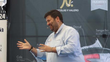 Desde la empresa almadrabera Juan Pablo Nicolás ha ido explicando con detalle todo el proceso, una exhibición de corte de manera ordenada al ejemplar, al que llegan a extraerle hasta 24 piezas, entre partes nobles y partes internas, tanto cortes tradicionales como los despieces aprendidos de la cultura japonesa. También con precisión ha ido detallando cada pieza y los usos habituales de cocina según cada parte del atún “cuya calidad viene marcada por la grasa”.