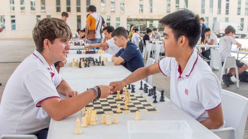 Alumnos de los IES Benat de Sarrià, Beatriu Fajardo de Mendoza, Mediterrània y del Colegio Internacional Lope de Vega, de Benidorm, junto a estudiantes del Arabí de l’Alfàs de Pi y de la Malladeta de la Vila Joiosa, han tomado la icónica plaza benidormense donde se están celebrando simultáneamente decenas de partidas.