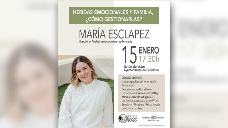 La edil de Educación del Consistorio benidormense, Maite Moreno, ha explicado que esta charla correrá a cargo de la psicóloga sanitaria María Esclapez especializada en psicología clínica y de la salud, escritora y conferenciante y que, después de la misma, habrá una firma de libros por parte de María Esclapez en colaboración con una librería local.