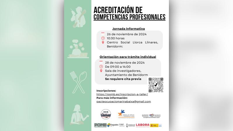 La Concejalía de Empleo y Desarrollo Local y a la Mesa de Empleo de Benidorm han organizado una jornada informativa sobre la ‘Acreditación de Competencias Profesionales’, que tiene por objetivo dar a conocer a los asistentes el procedimiento de acreditación de competencias. Este procedimiento permite obtener un título oficial, que puede ser desde un certificado de profesionalidad hasta un título de FP de grado medio o superior, aportando la experiencia laboral o formación no oficial, y tras una posterior entrevista con un tribunal, que evaluará los conocimientos que se hayan acreditado. La concejal de Empleo y Desarrollo Local, Mónica Gómez, ha señalado que este procedimiento de acreditación “es gratuito hasta diciembre de este año”, de ahí el interés por organizar esta jornada formativa para todas las personas que puedan estar interesadas en convalidar sus conocimientos.