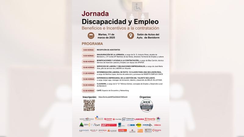 La Mesa de Empleo de Benidorm, conformada por el Ayuntamiento de Benidorm y diversas entidades públicas y privadas con programas de empleo y formación y asociaciones empresariales, ha organizado la jornada ‘Discapacidad y Empleo: Beneficios e Incentivos a la contratación’. Una jornada que tendrá lugar el próximo 11 de marzo en el Salón de Actos del Ayuntamiento a partir de las 09.30 horas y que está dirigida a responsables de recursos humanos, gestorías, empresarios de cualquier sector económico, así como personas con alguna diversidad funcional y público en general que desee actualizar sus conocimientos sobre las bonificaciones e incentivos a la contratación de personas con diversidad funcional, así como conocer ejemplos de buenas prácticas a través de experiencias de éxito.