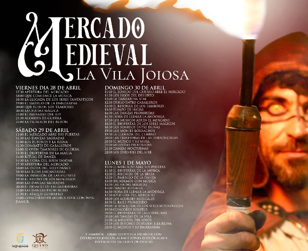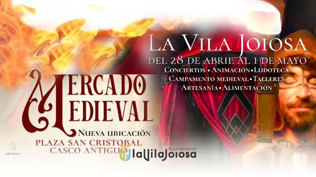 La concejalía de Fiestas del Ayuntamiento de la Vila Joiosa acerca un año más el tradicional Mercado Medieval al casco histórico de la localidad. Del 28 de abril al 1 de mayo, residentes y visitantes de la Vila Joiosa podrán transportarse en el tiempo y disfrutar de una experiencia única en este tradicional evento que se ha convertido en una de las actividades más populares en torno a estas fechas.