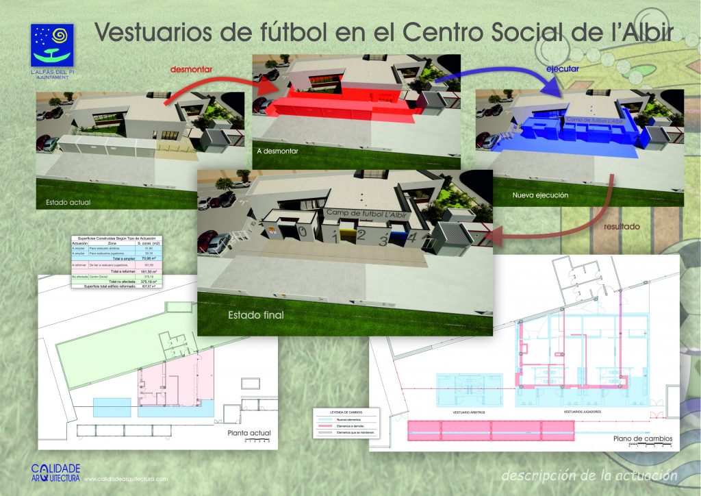 Los vestuarios en construcción en el local del Centro Social de l’Albir, destinado inicialmente a bar y cocina, culminan el proceso de ampliación y mejora de las infraestructuras destinadas a la práctica del fútbol en la zona de l’Albir, donde primero se construyó un campo de fútbol 8 de césped artificial (295.983,47 euros), en el recinto deportivo de la calle San Miguel anexo al campo de fútbol 11 ya existente, que una vez finalizaron las obras del primero, se ejecutaron las reformas en el terreno de juego del segundo, el campo de fútbol de césped artificial 11 (366.486,53 euros) que llevaba trece años en servicio y tuvo que afrontar una reforma profunda, quedando ambos campos en perfecto estado y adecuados a la normativa actual, a falta de unos vestuarios a la altura de las nuevas instalaciones, que ahora han comenzado a construirse. Such incide llegado a este punto “era un compromiso adquirido por el Equipo de Gobierno de Arques con los deportistas, y con los clubes”.