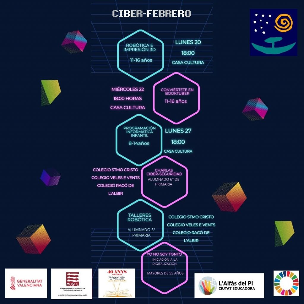 La concejalía de Educación del Ayuntamiento de l’Alfàs del Pi, en colaboración con Cultura y Bienestar social, pone en marcha el programa ‘Ciber Febrero’, para promover el conocimiento y buen uso de las nuevas tecnologías entre los más jóvenes y las personas mayores de 55 años. Con talleres y actividades gratuitas enfocadas a cada sector poblacional que comenzarán el próximo 20 de febrero. Las plazas son limitadas y es preciso inscribirse previamente en la Casa de Cultura.