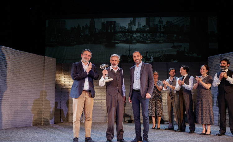 El actor Imanol Arias recogía el Pi d’Honor de la 21 Mostra de Teatre de l’Alfàs, por toda una vida dedicada a las artes escénicas, y lo hacía en la Casa de Cultura con el aforo completo y el auditorio en pie tras la puesta en escena de ‘Muerte de un Viajante’, adaptación teatral de una de las obras clave del dramaturgo y escritor Arthur Miller, dirigida por Rubén Szuchmacher y adaptada por Natalio Grues.