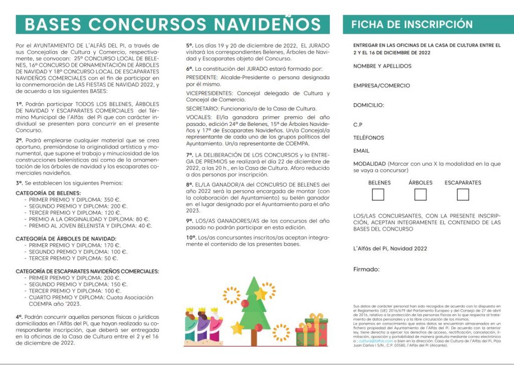 Se admiten todo tipo de materiales para la construcción de los belenes, la ornamentación de árboles de Navidad y la decoración de escaparates comerciales. El jurado tendrá en cuenta aspectos como la originalidad, la minuciosidad, la calidad e innovación, la iluminación o la exposición del producto. Se trata de incentivar el embellecimiento de l’Alfàs del Pi durante las fiestas navideñas.