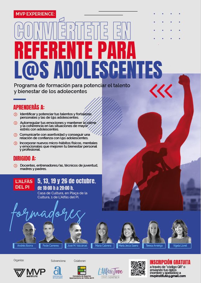 La Casa de Cultura de l’Alfàs del Pi acogerá el próximo mes de octubre el programa de formación ‘Conviértete en referente para l@s adolescentes’, una iniciativa que impulsa la Asociación MVP Institute, en colaboración con el área de Deportes de la Diputación de Alicante, con la que se pretende ofrecer recursos y estrategias prácticas a entrenadores, docentes, técnicos de juventud, madres y padres de toda la provincia, para desarrollar el talento y bienestar de los jóvenes.