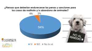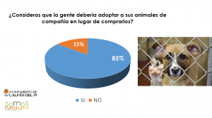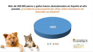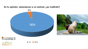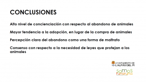 Entrevistaron a 60 estudiantes de 1º de ESO. Destaca el alto nivel de concienciación con respecto al abandono de animales. El 100% de las personas encuestadas lo considera preocupante y el 96% percibe el abandono como una forma de maltrato. Además, el 85% opina que la gente debería adoptar a sus animales de compañía en lugar de comprarlos y el 94% señala la necesidad de endurecer las penas y sanciones ante los casos de maltrato y abandono de animales.