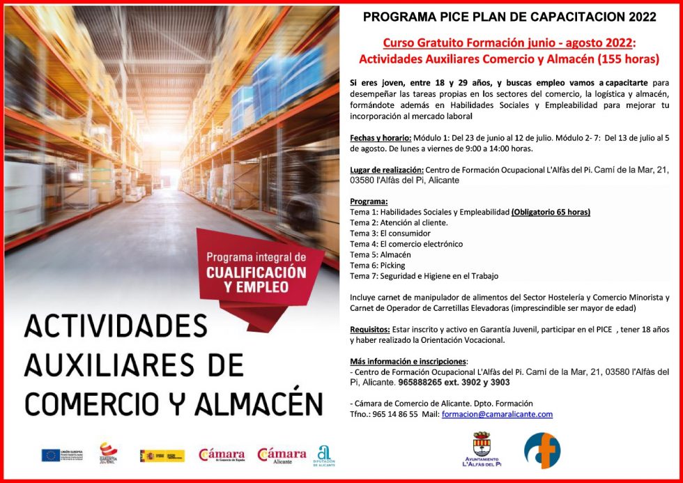 Este curso se imparte en l’Alfàs del Pi gracias al convenio de colaboración suscrito entre el Ayuntamiento y la Cámara de Comercio de Alicante, destinado a facilitar la empleabilidad de jóvenes de entre 16 y 29 años a través de un programa de formación gratuita dirigida a este segmento de edad, ya que son cursos financiados en su totalidad por la Cámara de Comercio de Alicante en el marco del Programa Nacional de Garantía Juvenil.