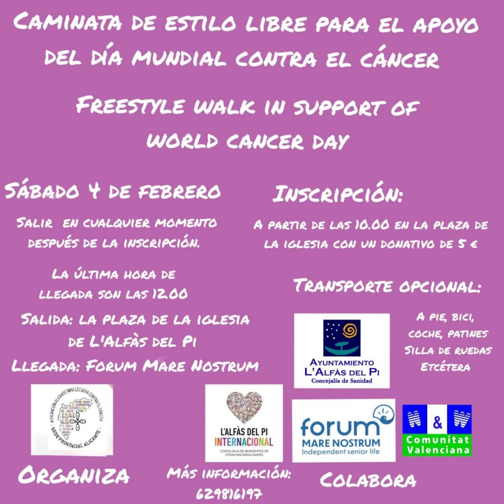Mañana sábado 4 de febrero l’Alfàs del Pi se suma a los actos conmemorativos del Día Mundial contra el Cáncer, y puedes participar en una marcha solidaria y una sesión de video forum.