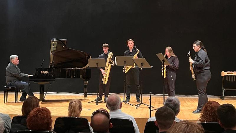 Las siguientes piezas fueron ‘Romance’ de J. Vitols, con el violín de Alina Stulgaite; ‘Danzas fantásticas’ (exaltación), de Joaquín Turina y el piano de Pedro Soler; ymientras que ‘Memorias’ de Pedro Iturralde, fue la obra con la que se cerró el concierto, con las voces de Elena García (soprano), Anouk Dom (alto), Nils Dom (tenor) y Joan Fuentes (barítono), además del profesor Pedro Mercado, que participó en el recital como pianista acompañante.