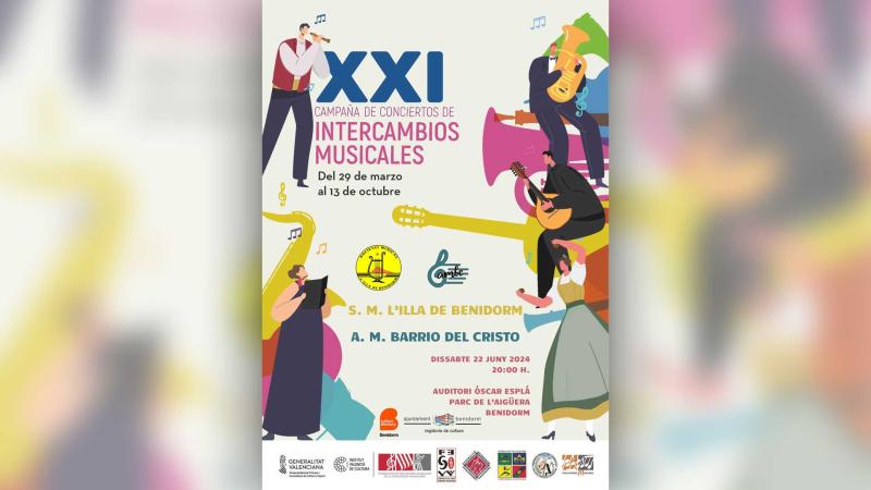 Por último, el sábado 22 a las 20 horas se celebrará el Festival de Bandas de Música organizado por la S. M. L’illa de Benidorm, que tendrá lugar también en el auditorio Óscar Esplá. Esta cita se incluye en la XXI Campaña de Conciertos de Intercambios Musicales organizada por la Federación de Sociedades Musicales de la Comunidad Valenciana que se desarrolla del 29 de marzo al 13 de octubre. En el mismo participarán la S.M. L’Illa de Benidorm y la A.M. Barrio del Cristo de Quart de Poblet (Valencia).