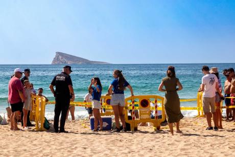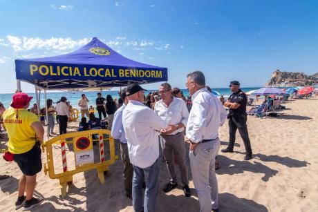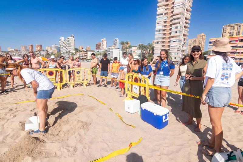Nada más recibir el aviso de varios usuarios de las playas testigos del desove, las unidades de Medio Ambiente y Playas de la Policía Local y el guarda rural del Ayuntamiento de Benidorm se han personado en el lugar, procediéndose de inmediato al balizamiento del nido hecho por la tortuga a escasos metros de la orilla.